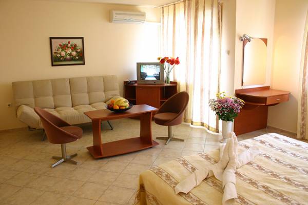 Хотелът разполага с 12 стаи, 3 студия и 3 апартамента, разположени на 3 етажа. Всички помещения са просторни, обзаведени са с мебели в съвременен дизайн и имат самостоятелни санитарни възли. Всяка стая има тераса, а от 3-я етаж се открива прекрасен изглед към Черно море.