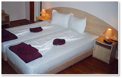 Each room is furnished with two beds and one additional for kids, TV set (cable TV), mini fridge and a bathroom-WC/shower.