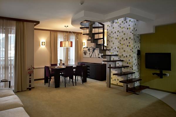 There are in total 16 very spacious unique studios and apartments. All are decorated in a fresh modern and relaxing style, colored in calm green, wooden brown and ecru with the idea od resembling the natural colors of the morvellous Pirin Mountain.